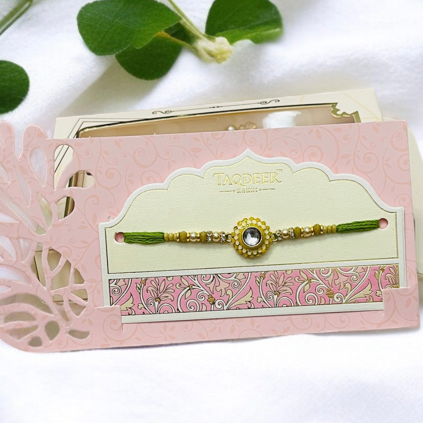 Celebrate the special bond with the Kundan AD Grey Thread Rakhi. Featuring intricate Kundan work set against a subtle grey thread, this rakhi offers a sophisticated touch that honors your bhabhi’s unique style.