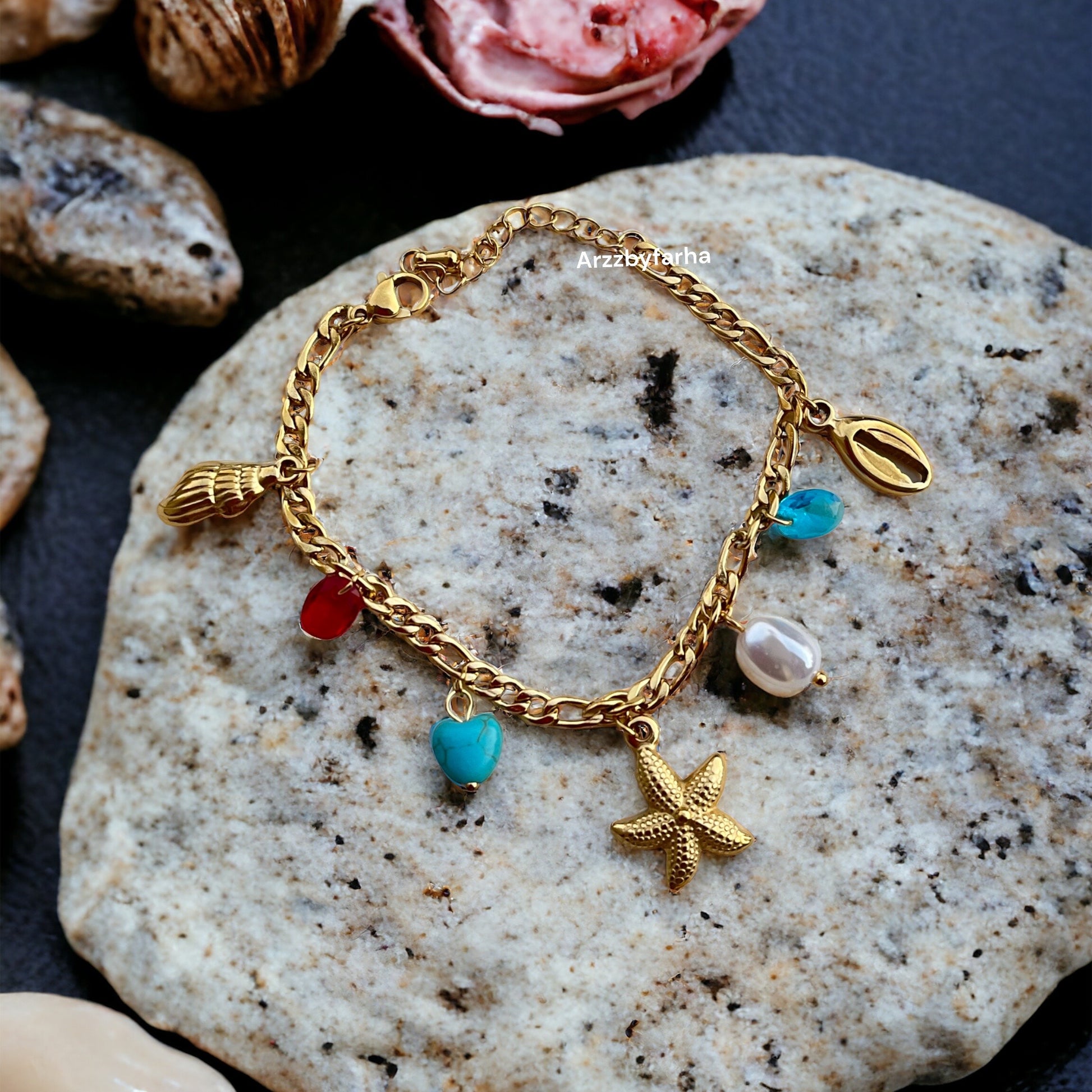 This multicolor charm bracelet is a must-have accessory for any jewelry collection. Made with high-quality materials, it features a variety of charms that add a touch of personalization and style. Perfect for any occasion, it's sure to elevate any outfit.