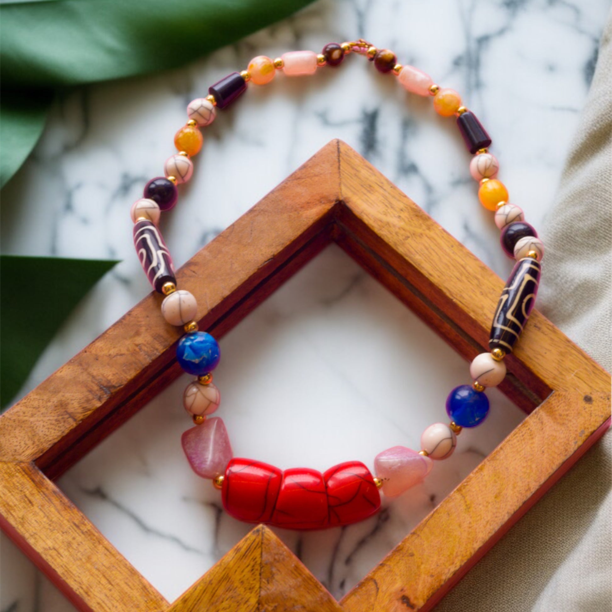 The Canvas & Beads Mid-Length Necklace expertly combines textured canvas elements with carefully selected beads, creating a unique accessory that balances artistry and wearability.