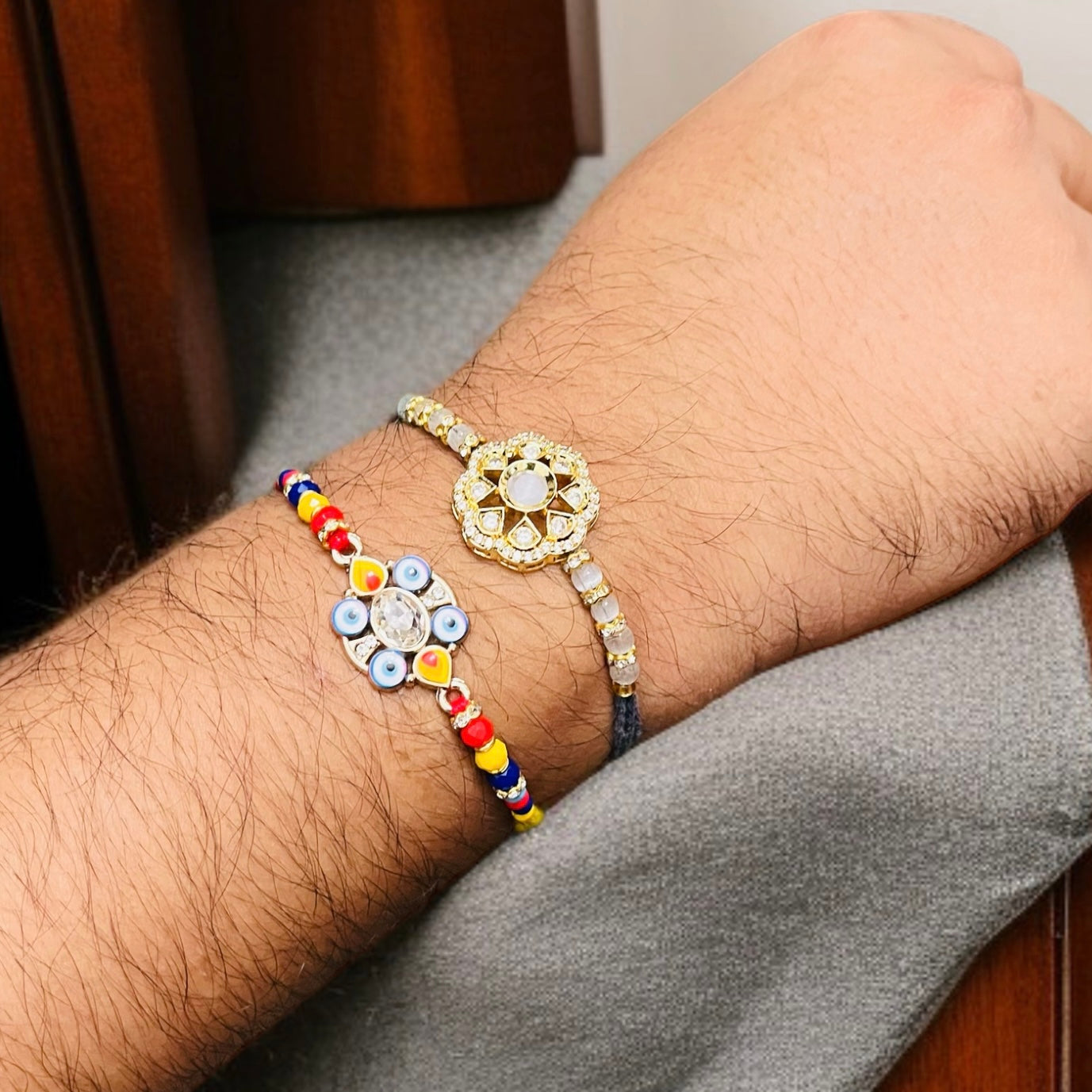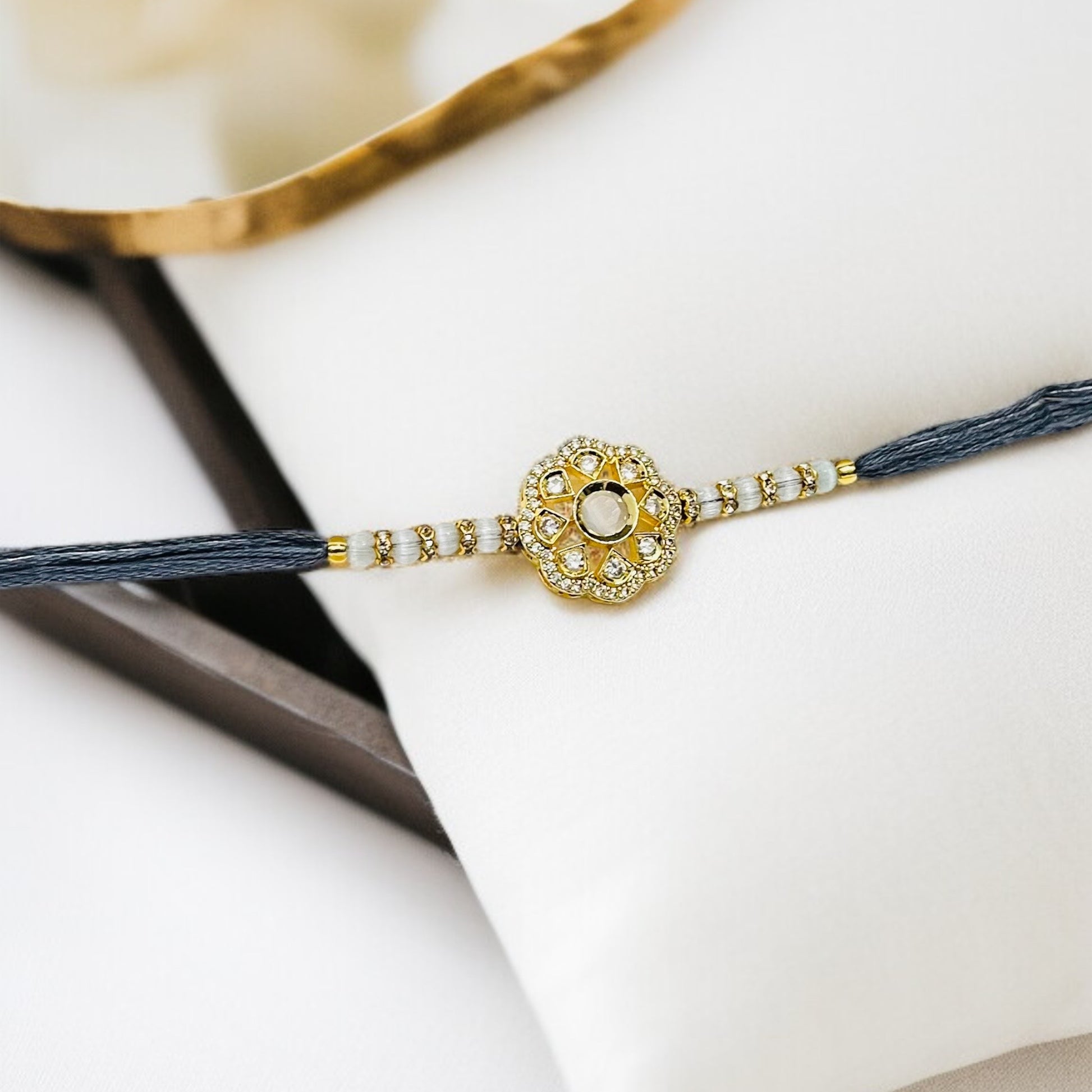 Celebrate the special bond with the Kundan AD Grey Thread Rakhi. Featuring intricate Kundan work set against a subtle grey thread, this rakhi offers a sophisticated touch that honors your bhabhi’s unique style.