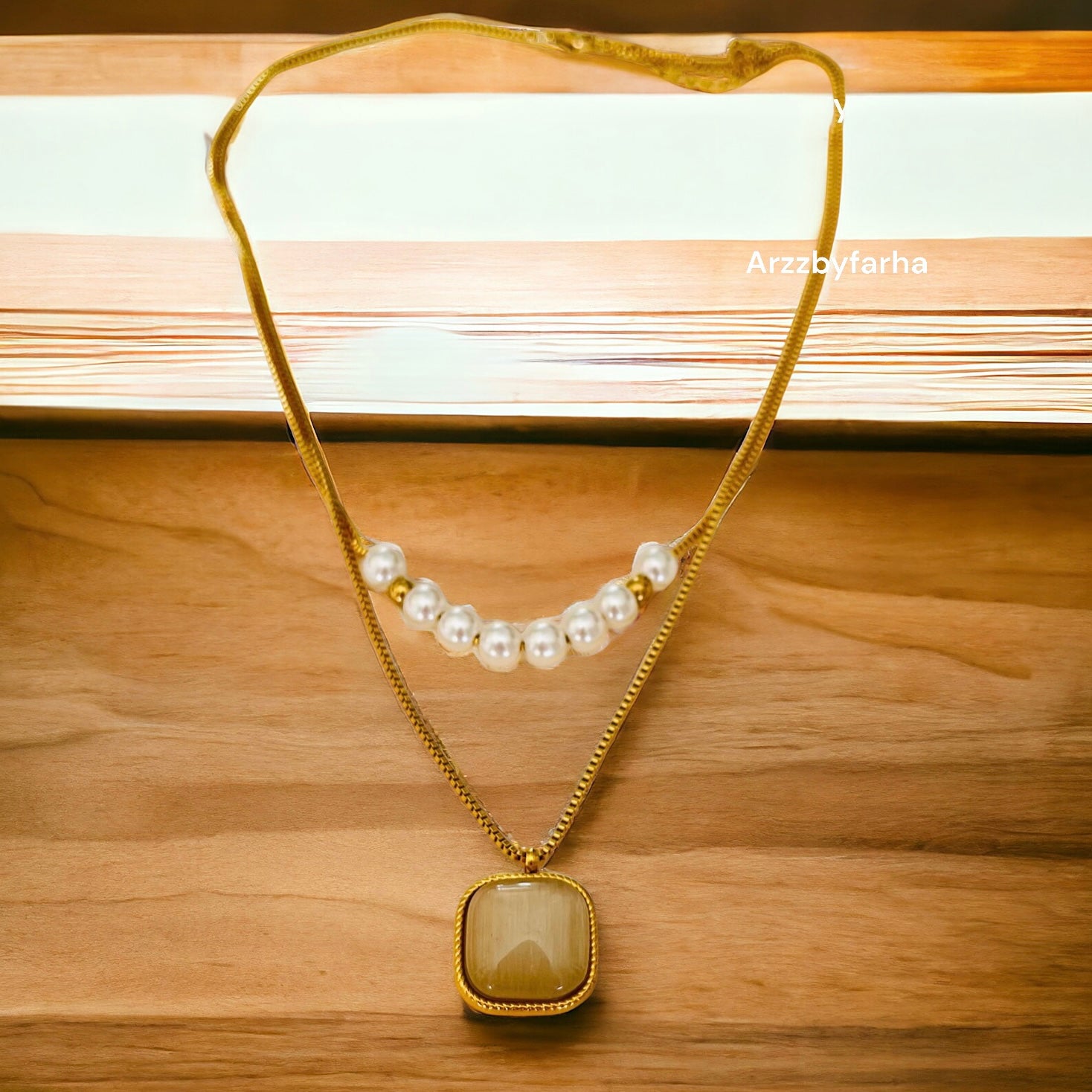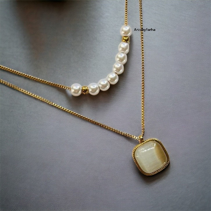 Discover the timeless elegance of our Milky White Stone with Pearl Layered Necklace. The delicate layers of white stone and iridescent pearls create a unique and sophisticated design. Accentuate any outfit with this stunning piece, perfect for any occasion.