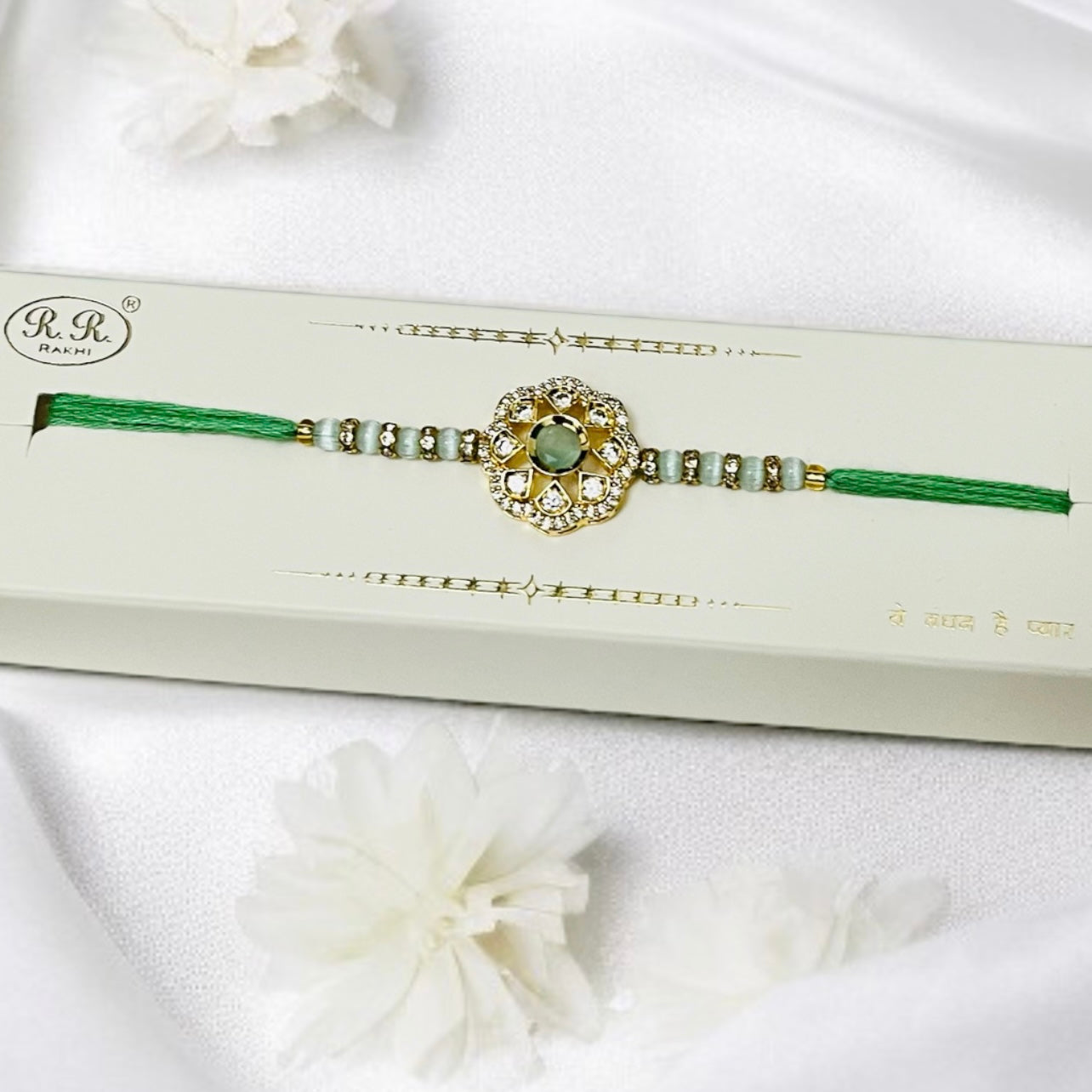 Celebrate the special bond with the Kundan AD Mint Thread Rakhi. Featuring intricate Kundan work set against a subtle grey thread, this rakhi offers a sophisticated touch that honors your bhabhi’s unique style.