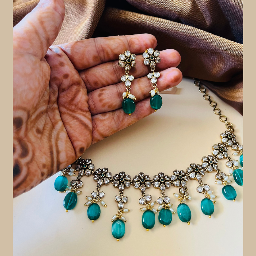 This expertly crafted necklace features regal gold-plated silver and stunning polki stones, accented by a border of exquisite pearls. The bottom is adorned with clusters of pearls and green semi-precious beads, giving this Jadau necklace a luxurious look.