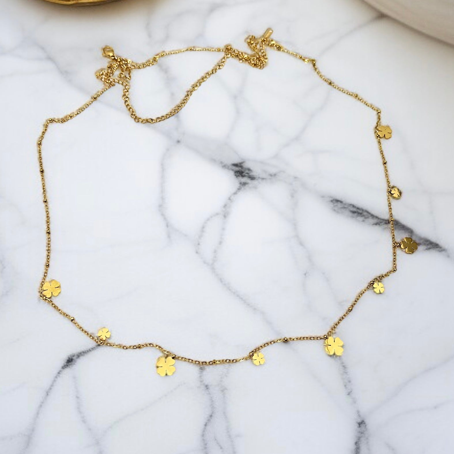 This 30-inch Clover Waist Chain features delicate 18-karat gold-plated clover links, blending elegance with subtle charm. Can be worn as a Necklace as well waist chain.