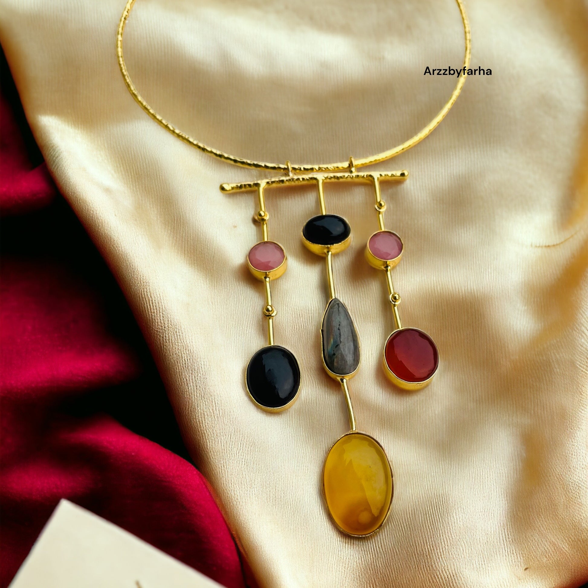 Discover the stunning beauty of our Multicolor Stone Fusion Hasli Necklace Set. Crafted with a fusion of colorful stones, this necklace set will add a touch of elegance to any outfit. Perfect for any occasion, it's a must-have addition to your jewelry collection.