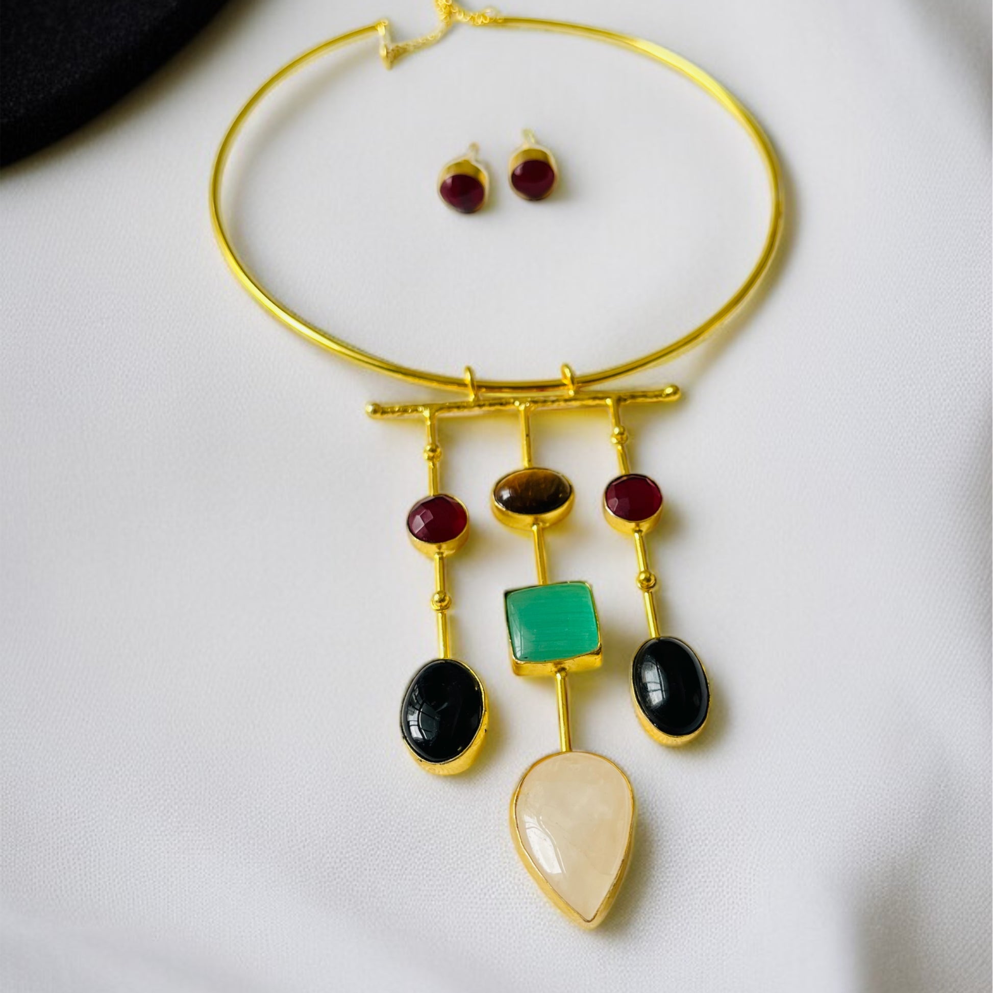 Discover the stunning beauty of our Multicolor Stone Fusion Hasli Necklace Set. Crafted with a fusion of colorful natural stones, this necklace set will add a touch of elegance to any outfit. Perfect for any occasion, it's a must-have addition to your jewelry collection.