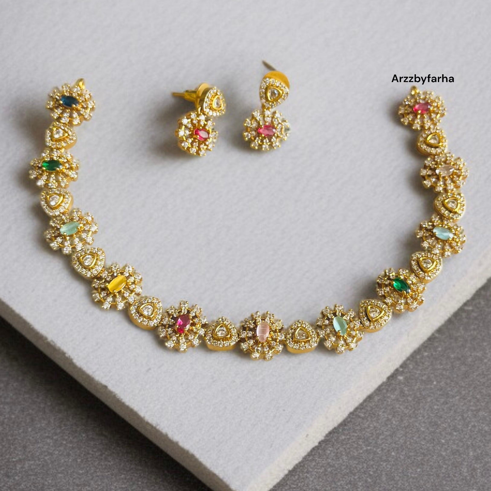 This elegantly designed Gold AD Studded Choker Necklace Set is the perfect accessory for any occasion. Crafted with precision and adorned with stunning gold AD studs, this necklace set will add a touch of glamour to your outfit. Enjoy the timeless beauty and versatility of this set for years to come.