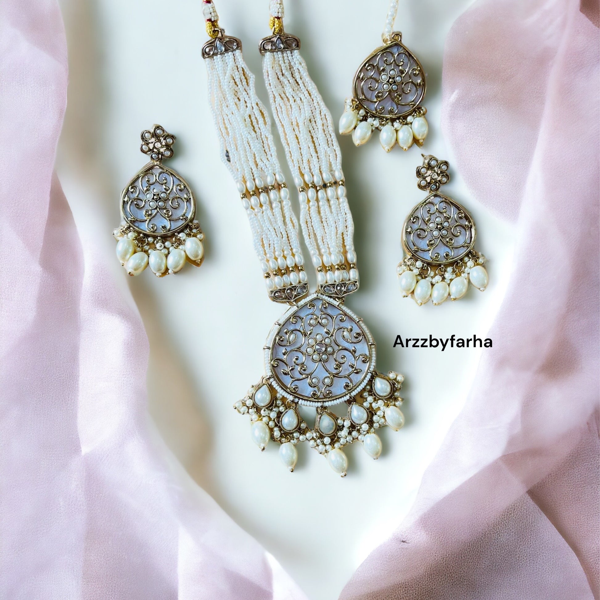 Contain : Mother of pearl necklace with a pair of earrings and maang tikka