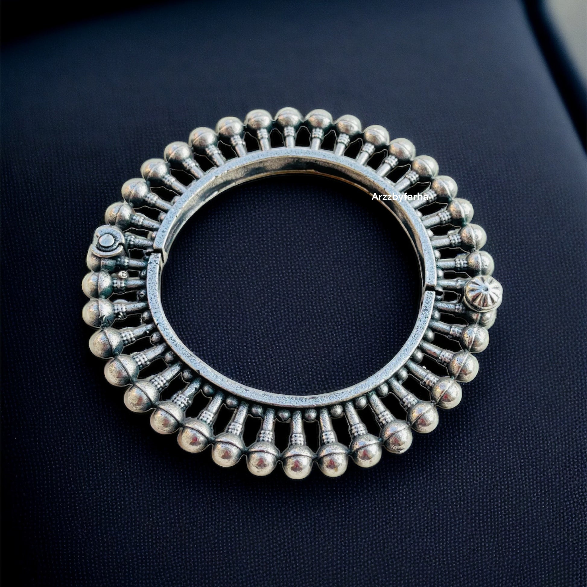 This Oxidised Screwable Bangle is a versatile and stylish accessory. Made with high-quality materials, it features a unique screwable design for easy customization and a dual tone finish for a modern touch. Perfect for any occasion, this bangle adds a touch of elegance to any outfit.