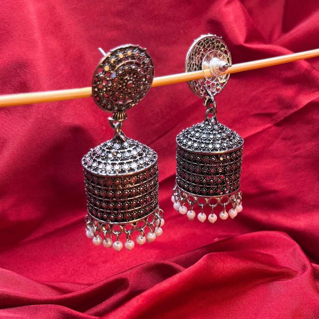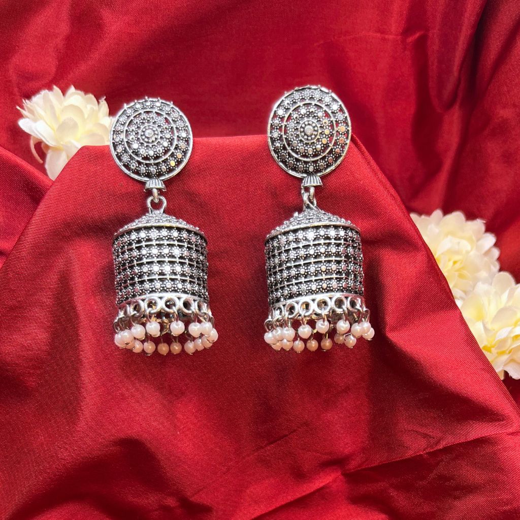 Oxidised Silver White Pearl Beaded Danglers Earrings