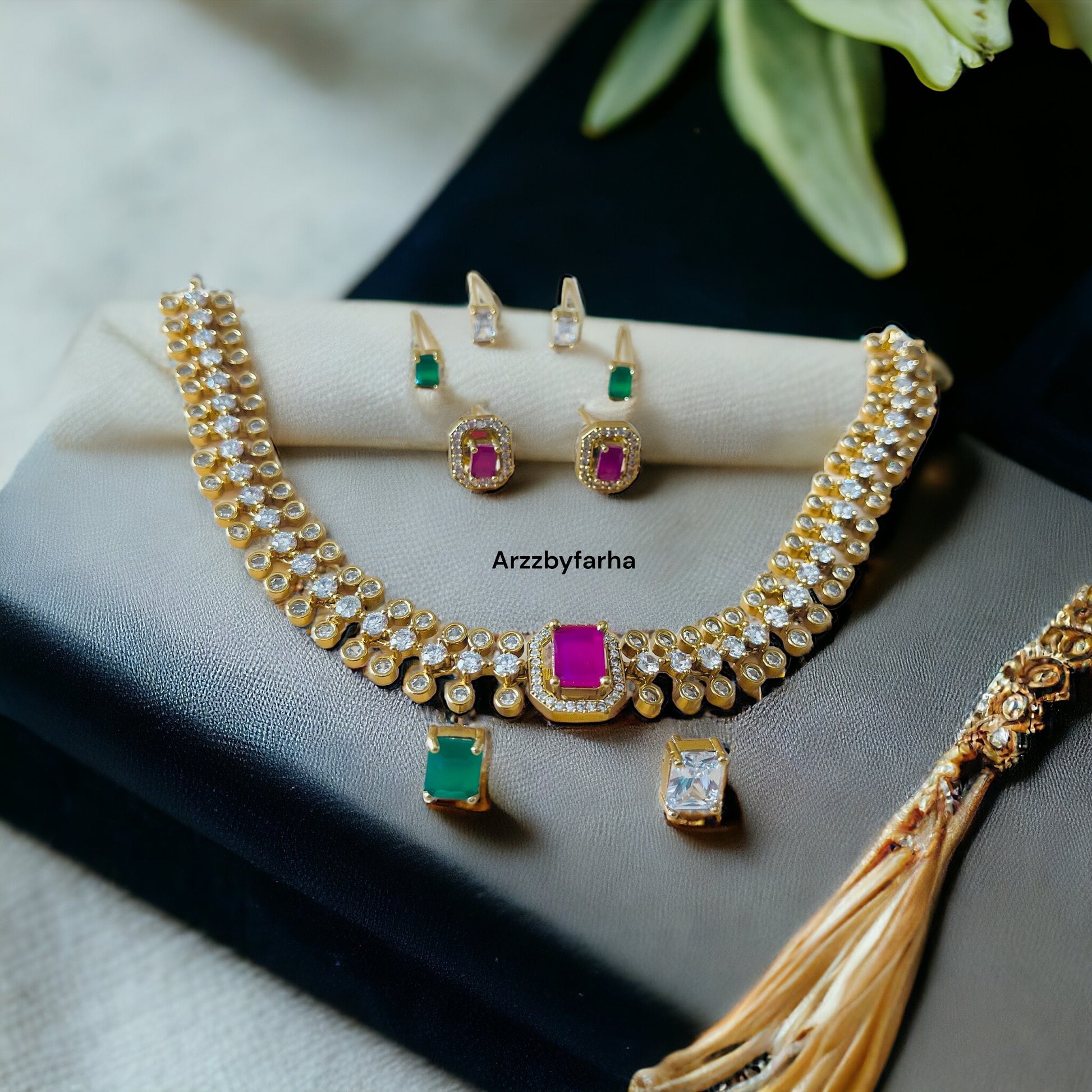 Color : Ruby Pink, Green and White Stone. It comes with 3 different stone for choker and Studs,