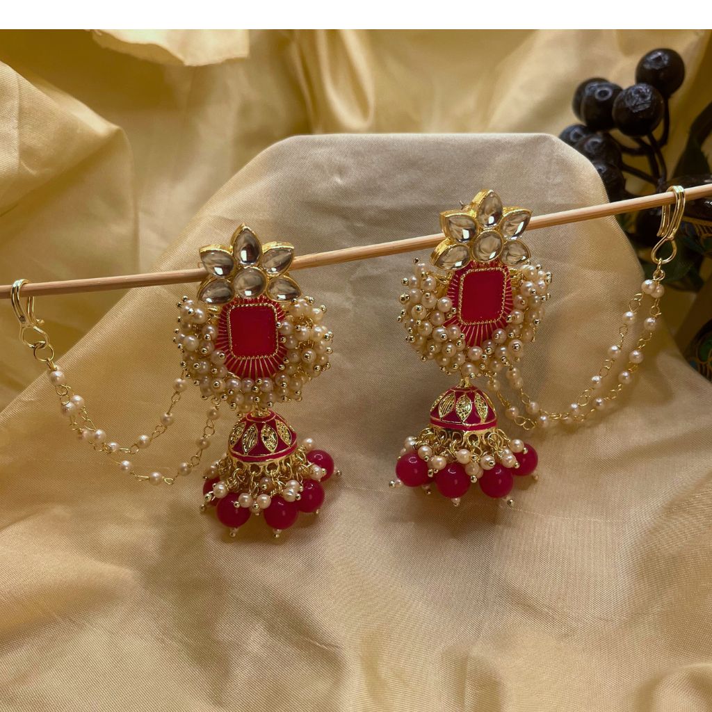 Pink Gold Tone Kundan Pearl Beaded Earrings With Ear Chains