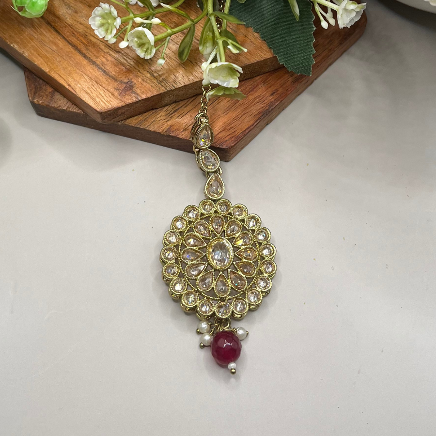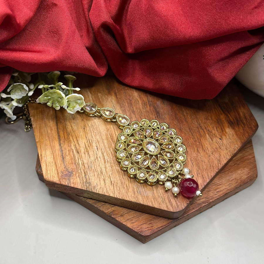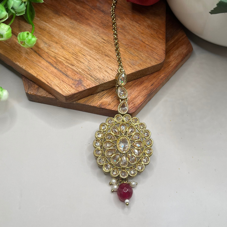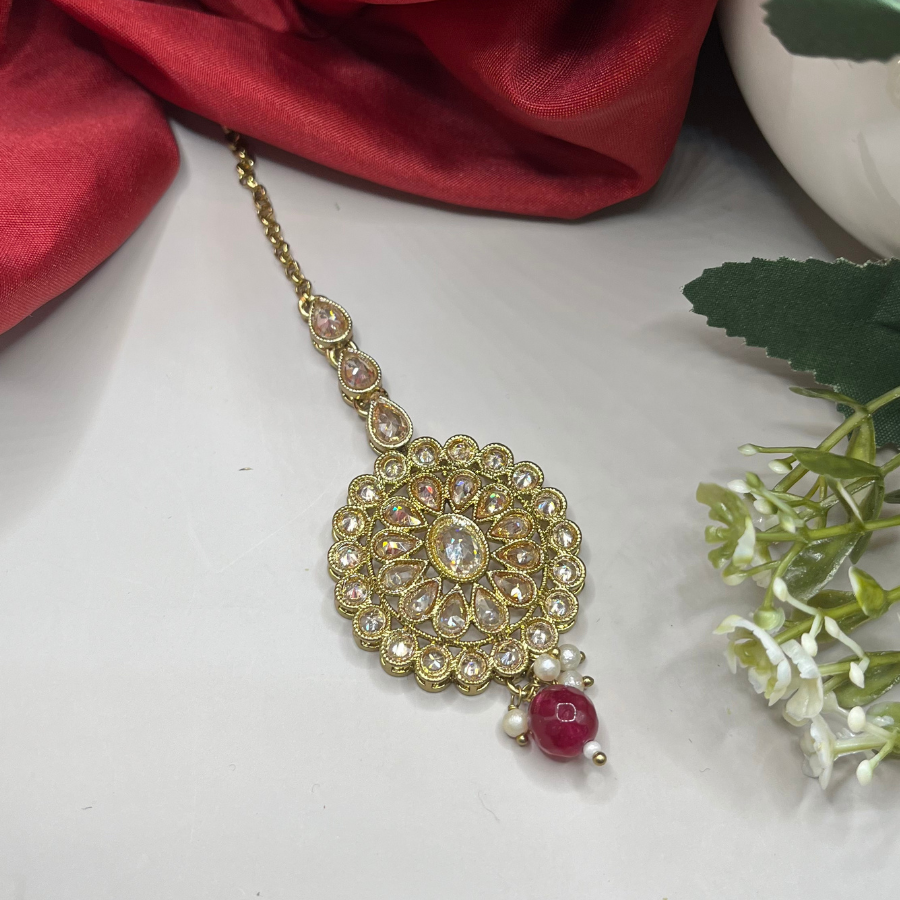 This Polki Maang Tikka is a traditional and ornate piece of jewelry that adds a touch of elegance to any outfit. Made with high-quality Polki stones, it features intricate designs and a comfortable-to-wear design. Complete your ethnic look with women's designer maang tikka
