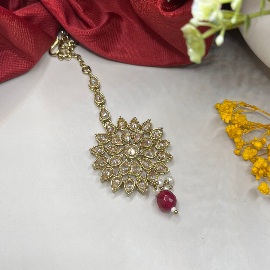 This Polki Maang Tikka is a traditional and ornate piece of jewelry that adds a touch of elegance to any outfit. Made with high-quality Polki stones, it features intricate designs and a comfortable-to-wear design. Complete your ethnic look with women's designer maang tikka