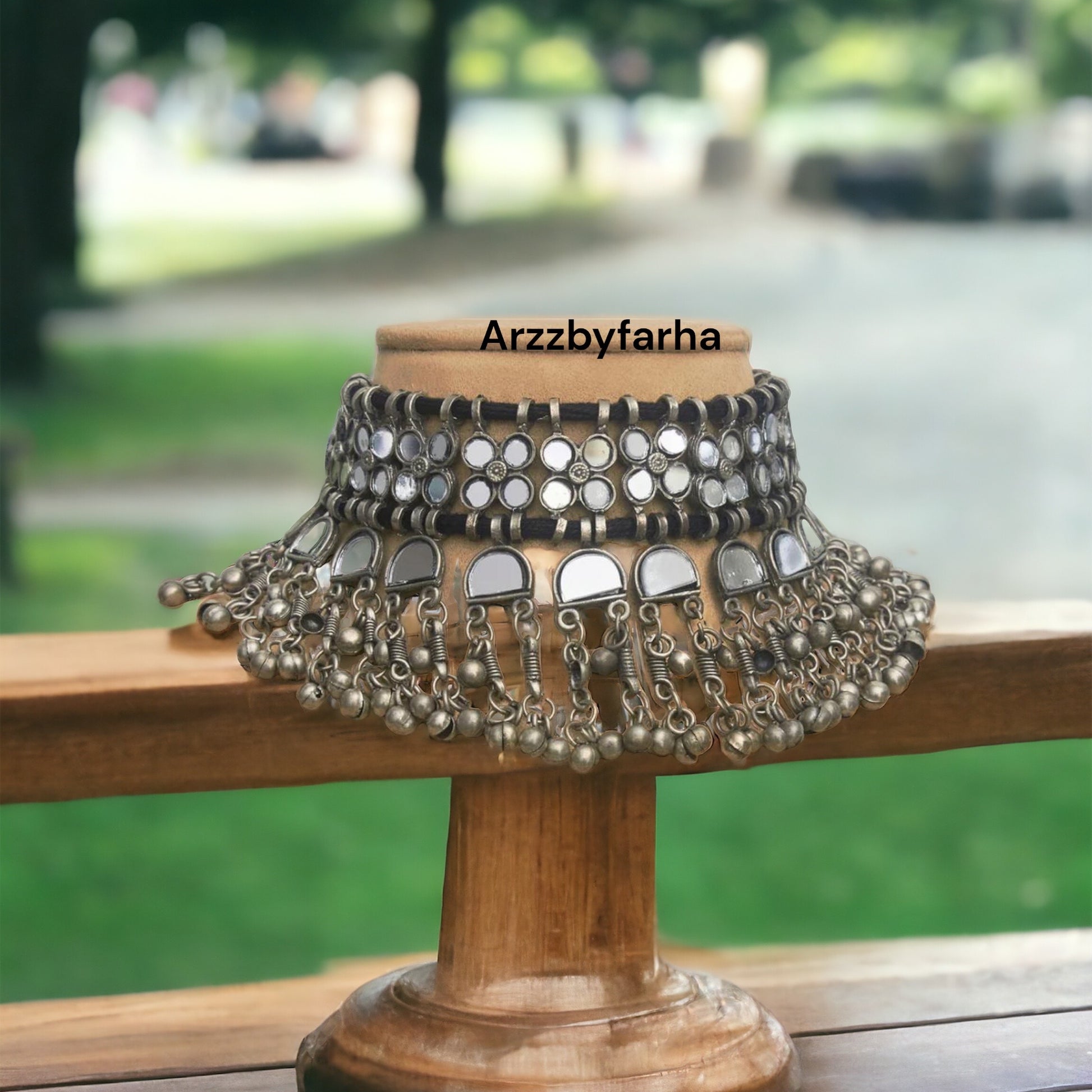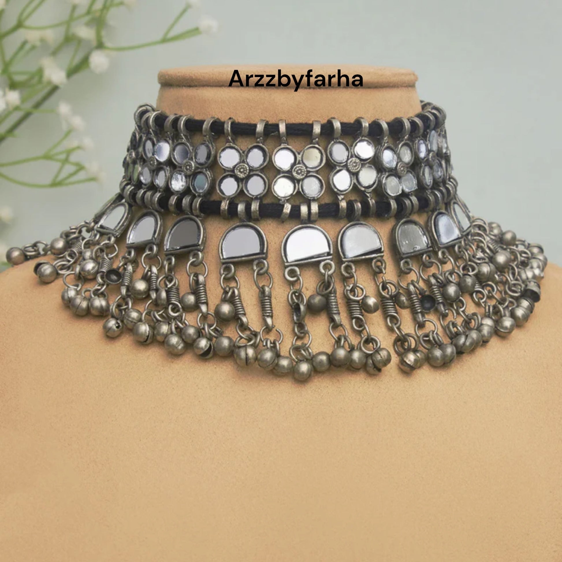 Perfect for any occasion, this multicolor mirror choker necklace set are a must-have for any fashion-forward individual and perfect piece for Navratri.