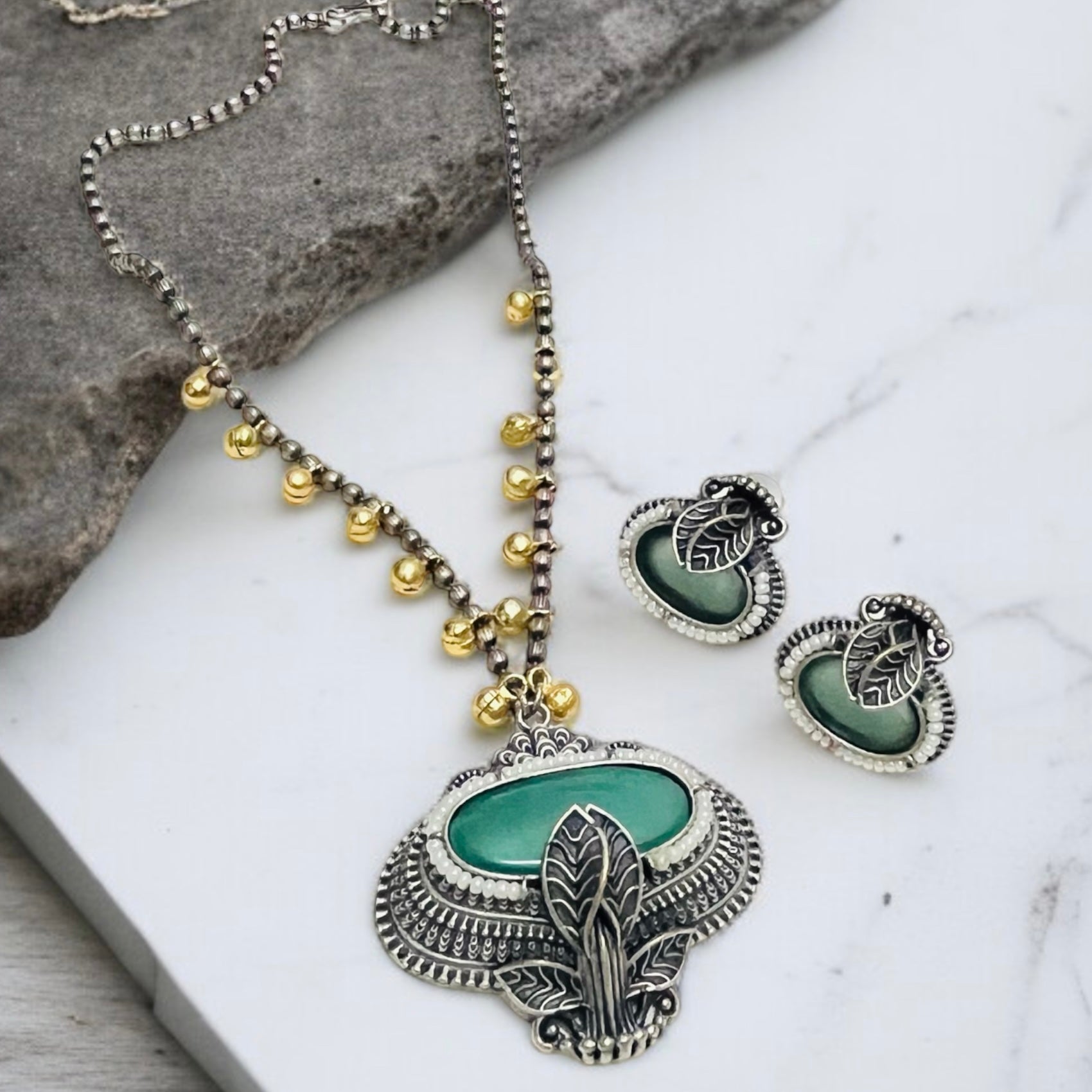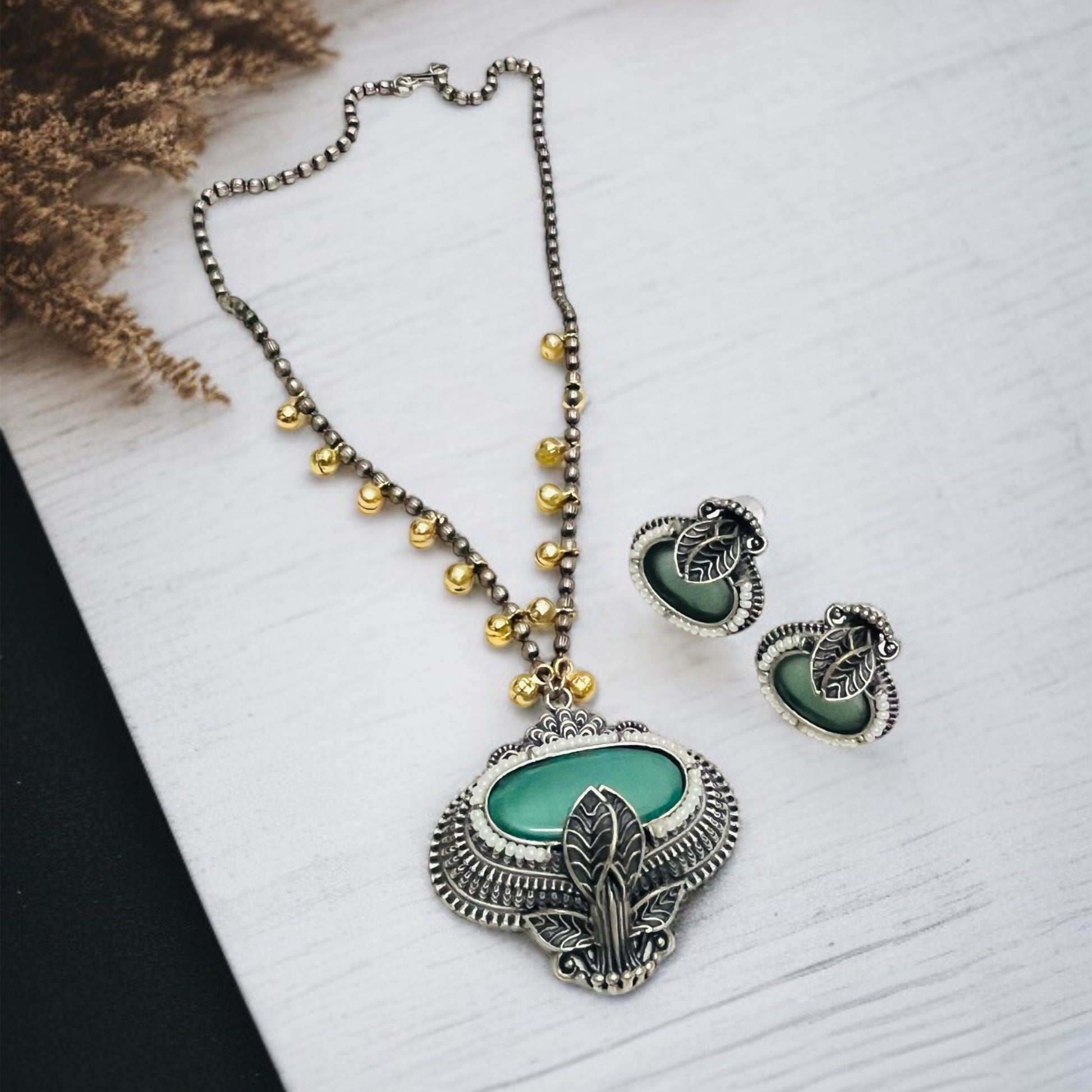 This necklace set featuring striking Mint Stones paired with golden ghunghroo accents delicately woven into the chain. This combination offers a sophisticated balance of boldness and traditional charm, perfect for enhancing both contemporary and ethnic outfits with a refined touch.